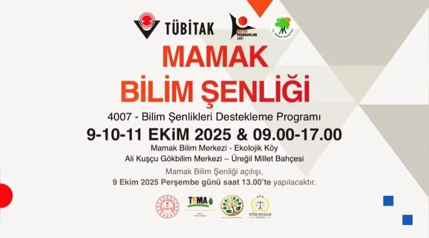Mamak’ta TÜBİTAK 4007 desteğiyle düzenlenen “Mamak Bilim Şenliği” 9–11 Ekim tarihlerinde Mamak Bilim Merkezi’nde başladı. Program; Ekolojik Köy, Üreğil Millet Bahçesi ve Ali Kuşçu Gökbilim Merkezi’ne yayılan etkinliklerle sürüyor.
